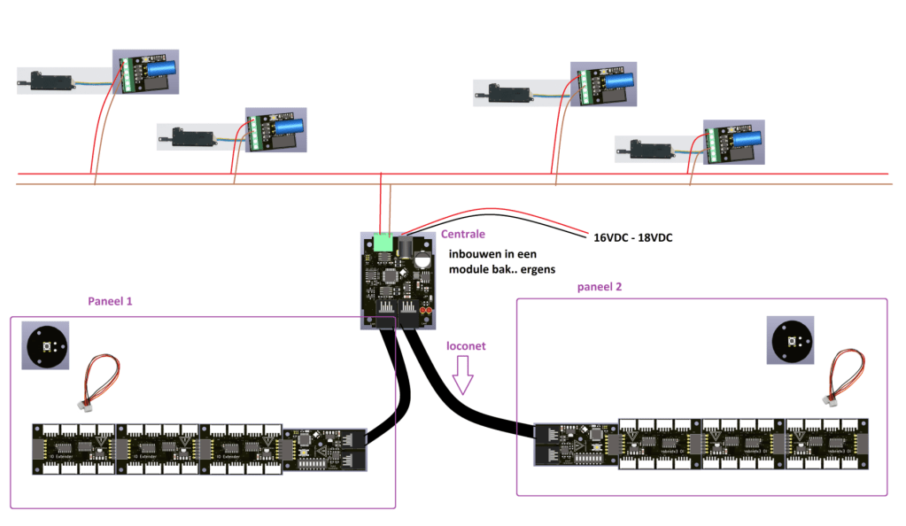 En doordat je schakelpaneel op loconet zou werken, hoef je niet meer dan een 6 polig Loconet kabeltje in je paneel te prikken voor het aansluiten. Je hoeft dan nooit meer een mega kabelboom naar je schakelpaneel te trekken