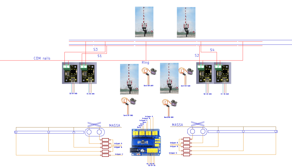 De werking: Elk spoor heeft een setje sensoren. Er zit één sensor links van de overgang en één sensor rechts van de overgang. De eerste sensor die wordt getriggerd, werkt als inrijsensor. Zodra er een trein in de inrijsensor rijdt, wordt dat spoor bezet gemeld.