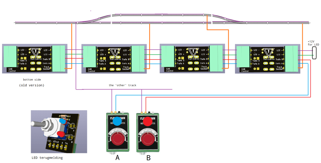 Elke schakelaar heeft 5 aansluitingen. De aansluiting naar het spoor, de ringleidingen van Trafo A en B en nog 2 voedingslijntjes voor de LED terugmelding. De print wordt geleverd met een blauwe en een rode LED om goed te kunnen zien of een spoor nu op de A of B transformator is aangesloten of op niks (beide LEDs zijn dan uit).