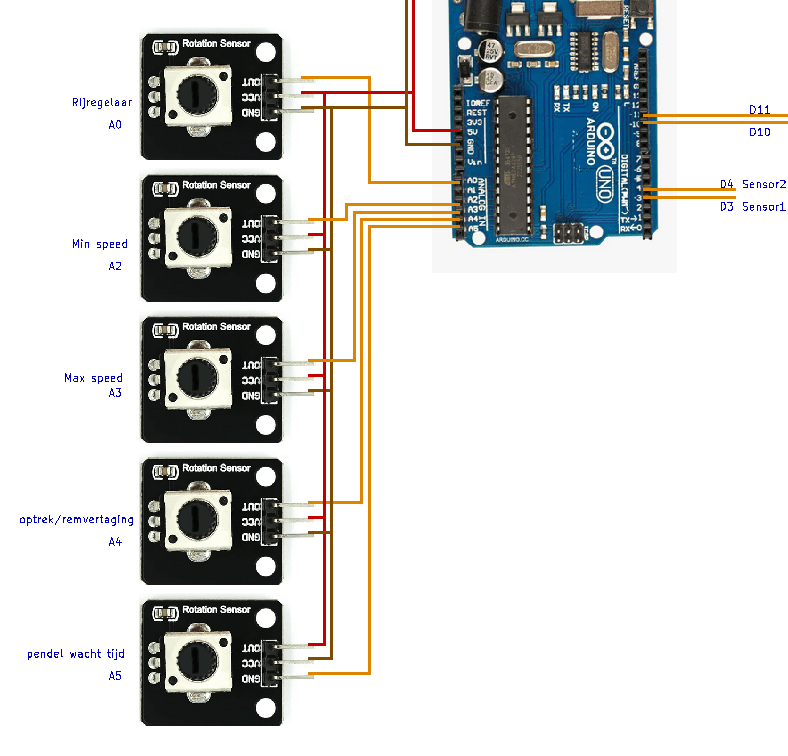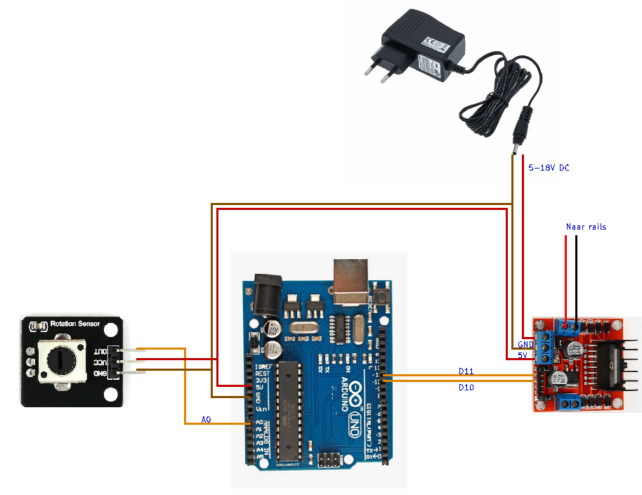 De PWM regelaar is aanstuurbaar met een potmeter. Je bent hier in vrij om zelf een potmeter naar keuze te namen. Door de potmeter naar links te draaien, zal een trein naar links bewegen en door de potmeter naar rechts te draaien zal de trein de andere kant op rijden.