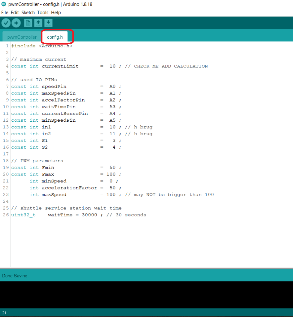 In dit lijstje kan je zelf bepaalde instellingen aanpassen door slechts wat nummertjes te veranderen. Zo kan je alle IO pinnen aanpassen naar believen, je kan de onder en boven freqenties van de PWM regelaar aanpassen, je kan de ingestelde stroomlimiet aanpassen en je kan standaard waardes aanpassen voor; minimale snelheid, maximale snelheid, en de optrek/remvertraging. Ook kan je de standaard wachttijd van 30s aanpassen voor de pendel wachttijd