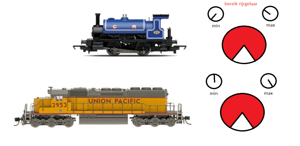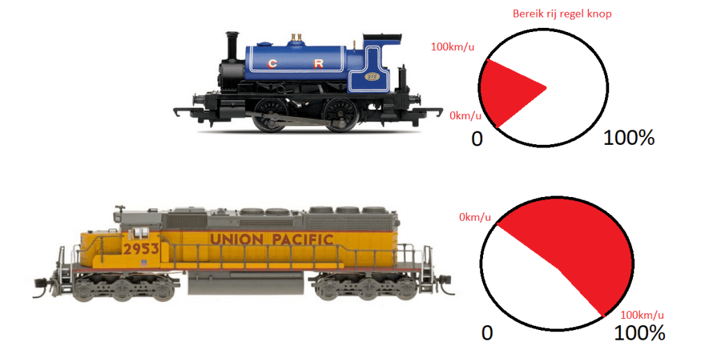 Omgekeerd rijden sommige treinen pas weg bij een vermogen van 40% en halen net aan een mooie snelheid op 100%. Ook hier kan je niet het volledige bereik van je rij-regelknop gebruiken.