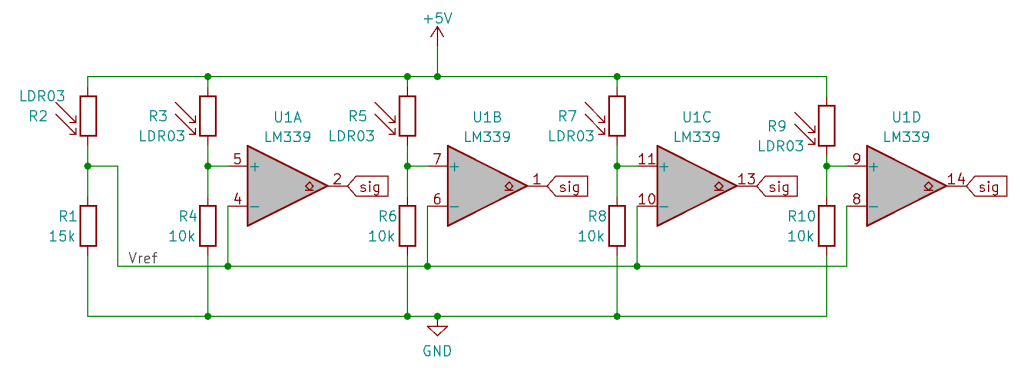 De meest linker LDR is met een grotere weerstand aangesloten op alle – poten van alle comperators. Deze maakt de referentiespanning en deze zal mee hobbelen met de omgevingslicht. De referentie LDR moet wel op een plek zitten waar die geen last heeft van externe invloeden zoals treinen ed.