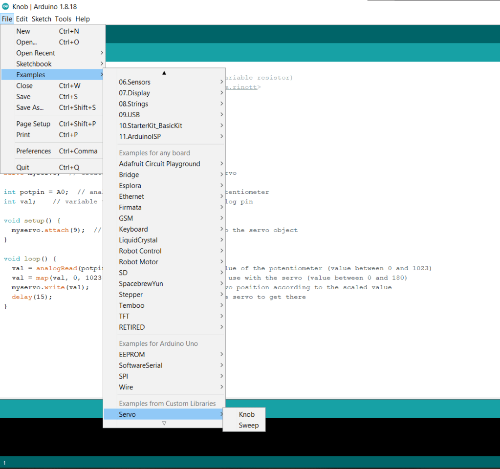 Om een arduino een servo te laten bewegen, moet je hem programmeren. Gelukkig heeft de Arduino Foundation voor ons een makkelijk te gebruiken library gemaakt met twee voorbeeld programma’s. Je vindt ze in examples -> Servo -> Knob of Sweep. Knob laat de servo een stand van een potmeter volgen, Sweep stuurt een servo continu aan (met vertraging) van 0° tot 180°.