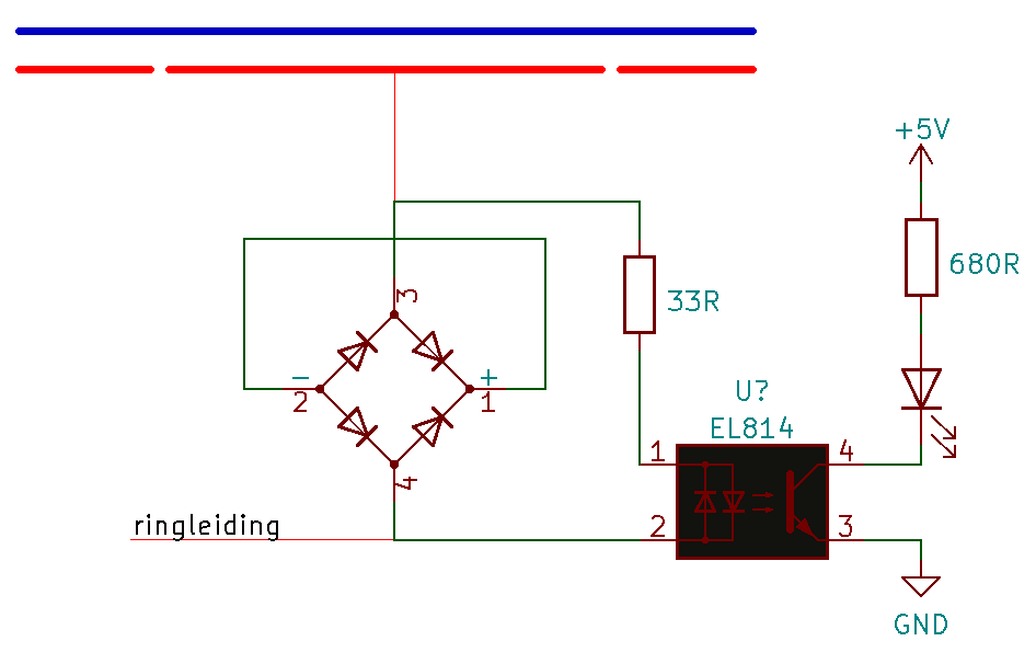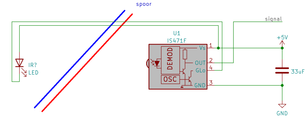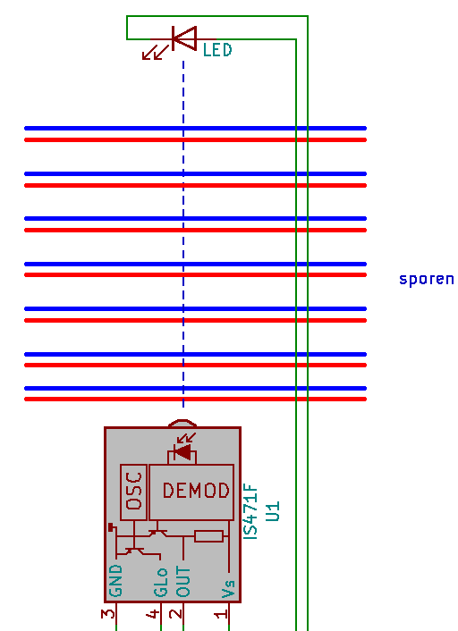 De basis bestaat uit een gelijkrichter, weerstand en een optocoupler. Wanneer er een trein rijdt over het aangesloten stuk spoor, dan gaat er een stroom vloeien van de ringleiding, door de gelijkrichter naar het spoor en naar de trein. Over de gelijkrichter, zal een spanningsval van grofweg 1,4V ontstaan. Deze 1,4V is hoog genoeg om de IR led in de optocoupler open te sturen. Het is hier wel voor nodig dat er een kleine serie weerstand in serie komt met de IR led.