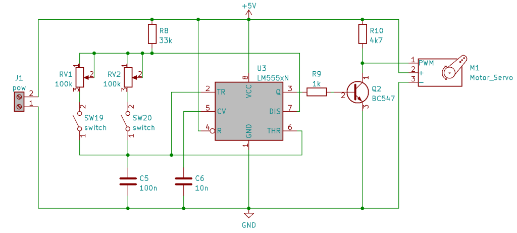De makkelijkste DIY manier om de 50Hz PWM signalen op te wekken, is door gebruik te maken van de beruchte 555 timer. Dit kan op meerdere manieren gedaan worden met schakelaars voor absolute standen of met een potmeter waarmee je zelf de stand kan kiezen. Het volgende schema maakt gebruik van 2 potmeters en 2 schakelaars. Met de schakelaars kan je de servo naar 1 van 2 standen sturen, met de potmeters kan je deze 2 standen instellen.