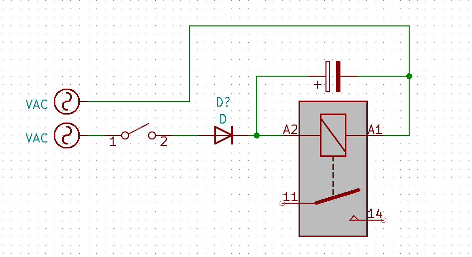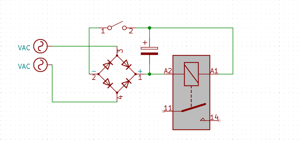 De schakelaar bedient hier het relais. Merk hier op dat het eigenlijk niet uitmaakt waar de schakelaar zit. Dit circuit richt de wisselspanning gelijk zodat je direct het relais kan voeden.