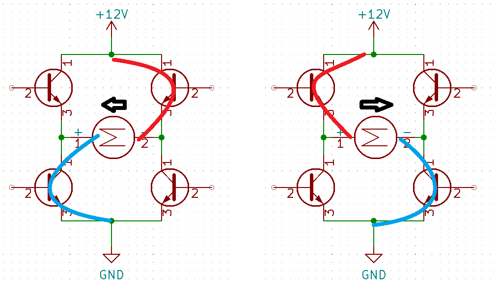 Door de transistors op de juiste manier te schakelen, kan je een DC motor in beide richtingen laten draaien.