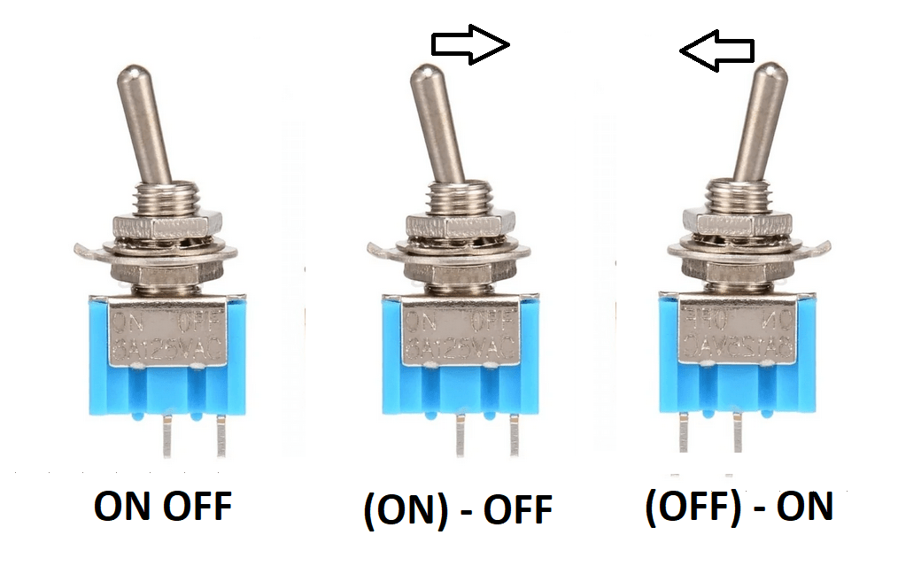 Het laatste aspect is de ruststanden van de schakelaars. Sommige van de schakelaars hebben bepaalde neutrale standen. Dan veren ze automatisch terug naar deze stand. Als we kijken naar een SPDT schakelaar allen, zijn er meerdere variaties.