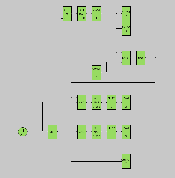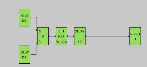 Als hier de Input D1 verandert, dan zorgt de map poort er voor dat of 90 of 180 wordt doorgegeven aan de delay en de delay verhoogt/verlaagt deze waarde elke 50ms todat de servo of op 90 of op 180 graden staat. Met een bereik van 90 graden en een delay tijd van 50ms zal de servo er 4500ms of 4,5s over doen om van 90 graden naar 180 graden te draaien.