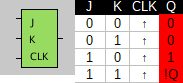 De JK flipflop is een van de meeste toegepaste logische poorten. Dit is ook een erge handige. De JK flipflop lijkt erg op de SR geheugenpoort maar heeft als toevoeging een klok (CLK) ingang. Deze poort doet alleen iets als de CLK ingang van laag naar hoog verandert (opgaande flank). Als J en K beiden hoog zijn dan zal Q omklappen van laag naar hoog of van hoog naar laag (toggelen) bij elke opgaande flank op Q.