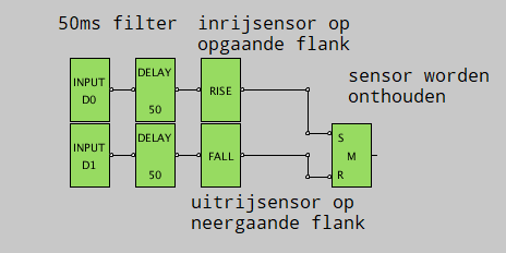 Hiervoor gaan we flank gevoelige inputs en ook geheugen nodig hebben. Laten we beginnen met het eerste spoor. Ik wil ook filtering van de ingangen gaan toepassen. Een sensor moet minstens 50ms gemaakt zijn, voordat er bezetmelding mag zijn.