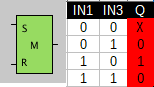 Als de set (IN1) hoog wordt, wordt Q hoog, als de reset (IN2) hoog wordt, wordt Q laag . Als set en reset beiden hoog zijn dan is Q laag (reset is dominant over set) en als beide ingangen laag zijn dan blijft Q wat hij is op dat moment. IN2 is niet aanwezig