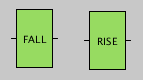 Deze twee blokjes geven beiden een korte puls af op Q van gedurende 20ms elke keer wanneer de ingang verandert. Bij de FALL poort komt de puls als de ingang van hoog naar laag gaat (neergaande flank) en bij de RISE poort is het andersom en komt de puls als de ingang van laag naar hoog gaat (opgaande flank).