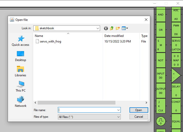 Als FunctionBloX wordt geopend, wordt er meteen gevraagd welk bestand je wilt openen. Als je een nieuw programma wilt maken, kan je op cancel drukken dan blijft alles blanco. Anders kan je een bestand naar keuze openen.