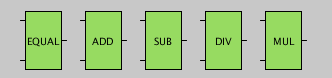 Er zijn momenteel vijf analoge blokken waarmee je kan rekenen. De EQUAL poort heeft ook een digitale uitgang. Q is hoog wanneer beide INs gelijk zijn aan elkaar.