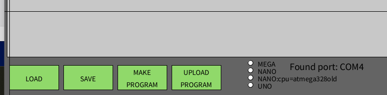 FunctionBloX V2 heeft een een extra set knoppen er bij gekregen om direct een Arduino board te programmeren zonder tussenkomst van de IDE. Als je Arduino is ingeplugd in de USB poort kan FunctionBloX zelfstandig uitvinden welke COM poort er gebruikt wordt. Je moet wel zelf selecteren welk board je gebruikt door op het witte bolletje te klikken voor het juiste board type. Met de knop ‘UPLOAD PROGRAM‘ wordt het FunctionBloX programma direct in je Arduino geladen.