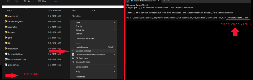 N.B. Het komt voor bij sommige PC’s dat de resolutie niet klopt. In dit geval helpt het om dit via de CMD terminal te doen. Klik rechts op een lege plek ergens in de folder, klik dan op Open in terminal en tik dan in de terminal .\functionBloX.exe druk daarna op ENTER om het programma te starten
