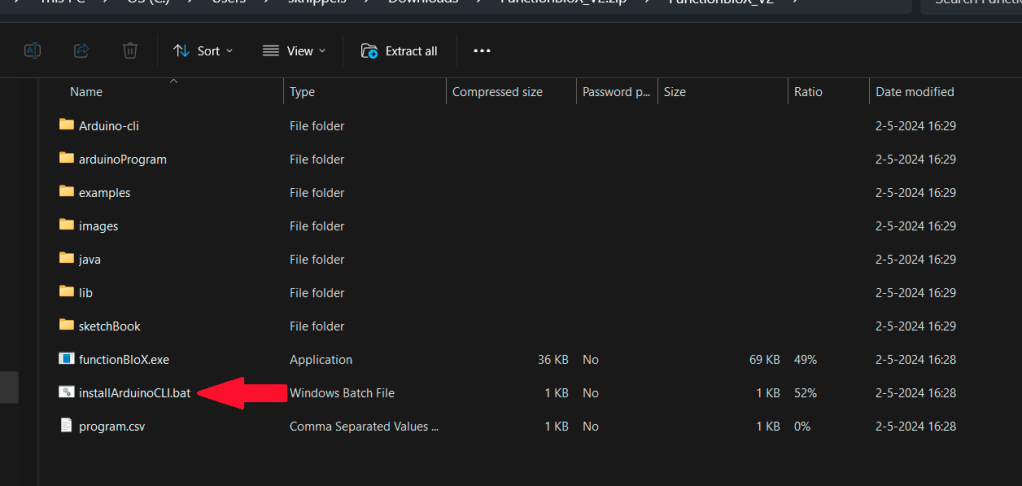 N.B. om in versie 2 gebruik te kunnen maken van de nieuwe “upload program” knop, is het nodig dat je eenmalig het het installatie script ‘installArduinoCLI.bat’ uitvoert. Je kan dit doen door er op te dubbelklikken. Windows zal je lastig vallen met verscheidene meldingen. Klik op ja/yes waar nodig is.