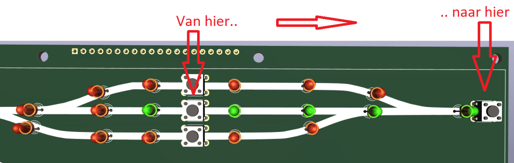 Er zitten ook een paar schakelaars op zonder ledjes. Ook kan ik pinnen gebruiken om bijvoorbeeld 2 leds voor een wissel aan te sturen. Met 1 pin kan ik dan 1 van 2 leds aanzetten of beiden uitzetten. Dat heb ik hier niet gedaan.