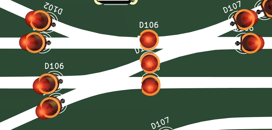 Vervolgens moet ik KiCad een schema tekenen. Bij dit paneel heb ik voor Nx stijl schakelen gekozen. Dat wil zeggen dat ik twee knoppen gelijktijdig moet indrukken om een route te leggen van begin tot eind. Elk spoor waar een trein kan staan heeft daarom een schakelaar nodig en tevens een ledje.