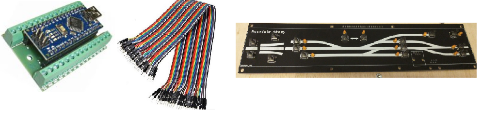 Ik heb momenteel twee soorten controllers die beiden met XpressNet werken. Met loconet ben ik nog bezig, maar dat is wel een optie. De eerste controller is een klein shield die je tussen een arduino nano en een schroef terminal shield kan prikken. Dit shield verbindt de arduino via XpressNet (of Loconet) met de centrale. Het schakelpaneel kan je dan aansluiten op de de schroefterminals via dupont kabels.