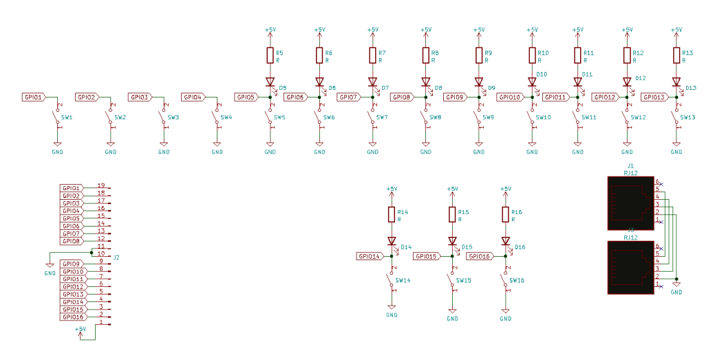Om zoveel mogelijk pinnen te besparen op de aansturing, sluit ik leds en schakelaars aan op 1 pin. Zowel schakelaar als pin kunnen de led aanzetten.