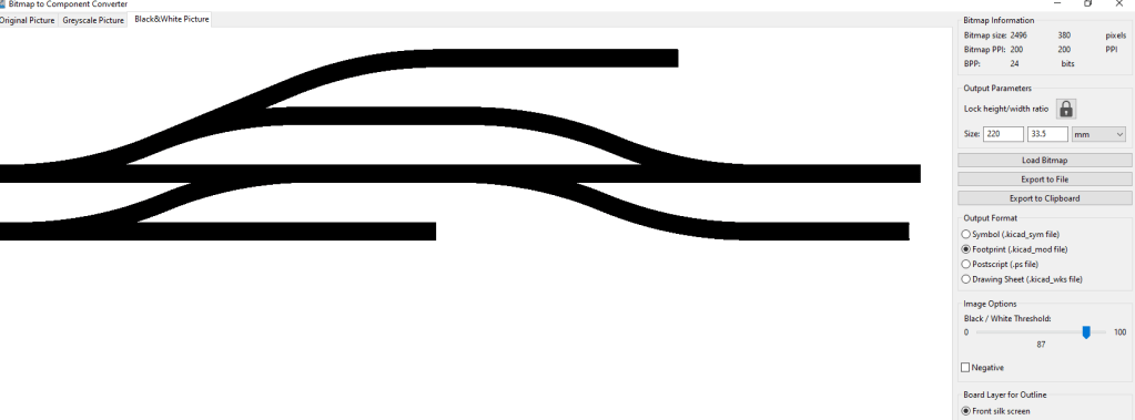Bij het maken van een schema gebruik ik meestal een schema van een vorig paneel omdat dat sneller werkt. Als ik het schema eenmaal heb, kan ik een board gaan ontwerpen. Het eerste wat ik dan doe, is het plaatje van Anyrail om te zetten naar een bepaalde footprint. Dat kan je doen met de image converter tool van KiCad. Je moet hierbij de grootte instellen. Dit kan je niet achteraf nog aanpassen, dan moet je een nieuwe footprint maken met een andere grootte.