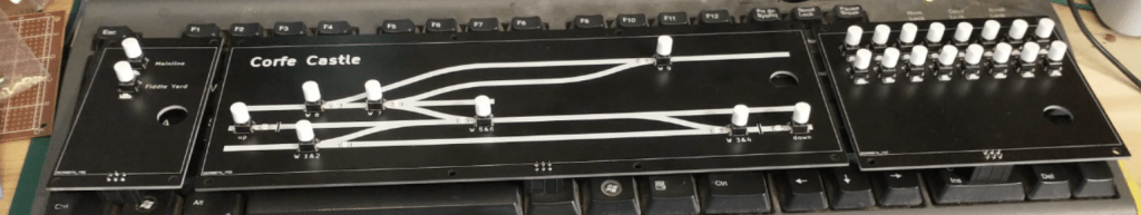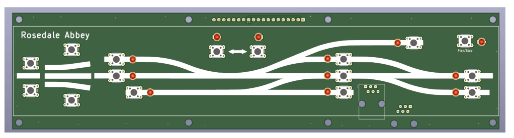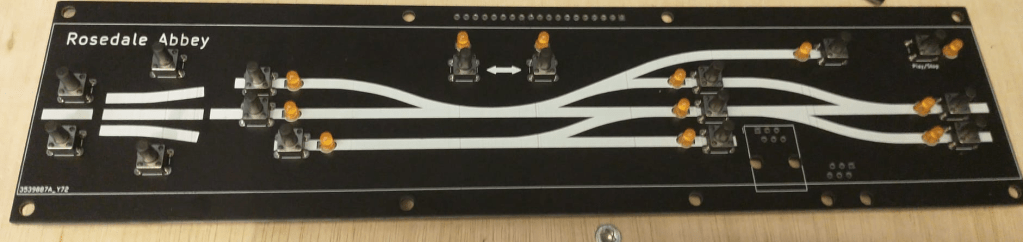 De baan, Rosedale Abbey, waarvoor dit paneel is, heeft links een dubbele segmentdraaischijf die ik met de vier linker knopjes kan bedienen. Tevens heb ik twee knopjes gebruikt om de analoge rijregelaar te bedienen en ik heb rechts boven in nog een knopjes waarmee ik programma’s kan opnemen en afspelen.