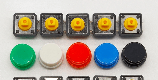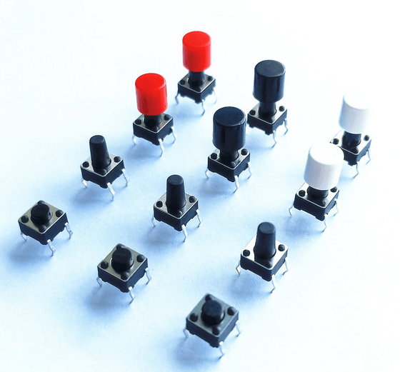 De standaard schakelaars die ik gebruik zijn korte 6x6mm tactile switches. Deze schakelaars zijn niet al te groot, klikken fijn, kunnen direct op een printplaat gesoldeerd worden, ze komen in verschillende lengtes en je kan een er een gekleurd kapje bijnemen.