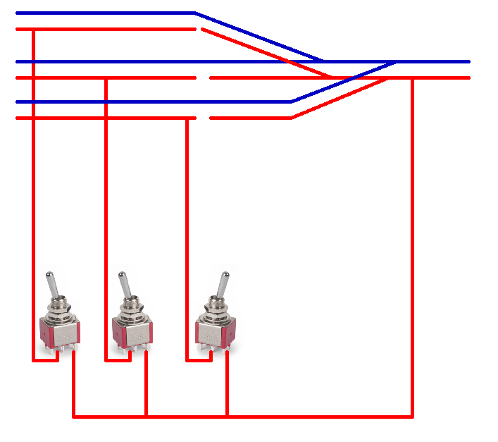 Om een wissel te schakelen, moet je de voedingsdraad (de middelste) aansluiten op een pool van je trafo en door de andere draden met schakelaars te schakelen naar de andere pool van de trafo, kan je wissel omzetten.