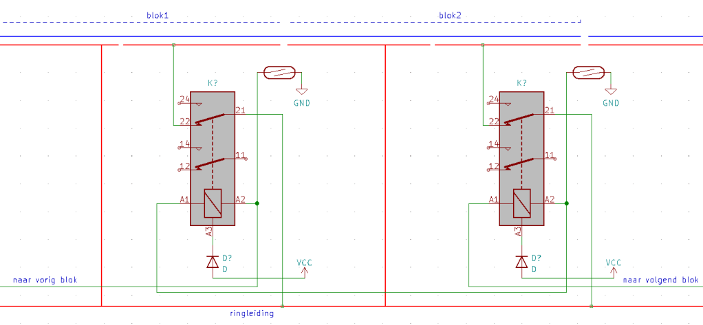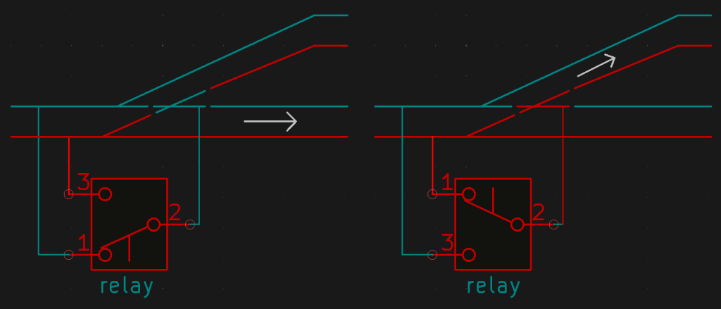 Om dat probleem op te lossen, kan je de schakelaars en de lange dunne draden gebruiken om ipv het spoor een relais aan te sturen. Het relais schakelt dan het spoor voor je. Doordat het relais dicht op het spoor zit, is er geen spanningsverschil meer tussen het hoofdspoor en een schakelbare sectie. Een eventuele spanningsverschil maakt voor de relaisspoelen niet zo veel uit.