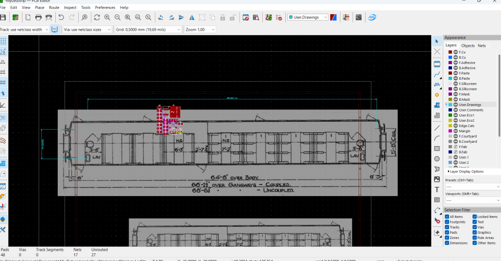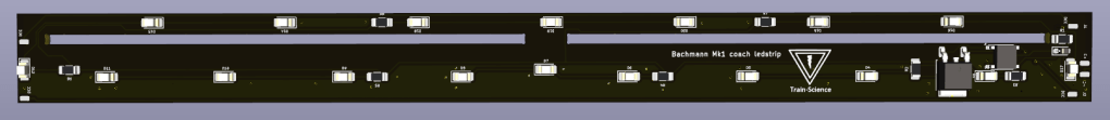 Elke printplaat in KiCad moet zgn. Edge cuts hebben. Dat zijn de contouren van de printplaat. In het geval van deze Mk1 coach zien mijn edge cuts er zo uit
