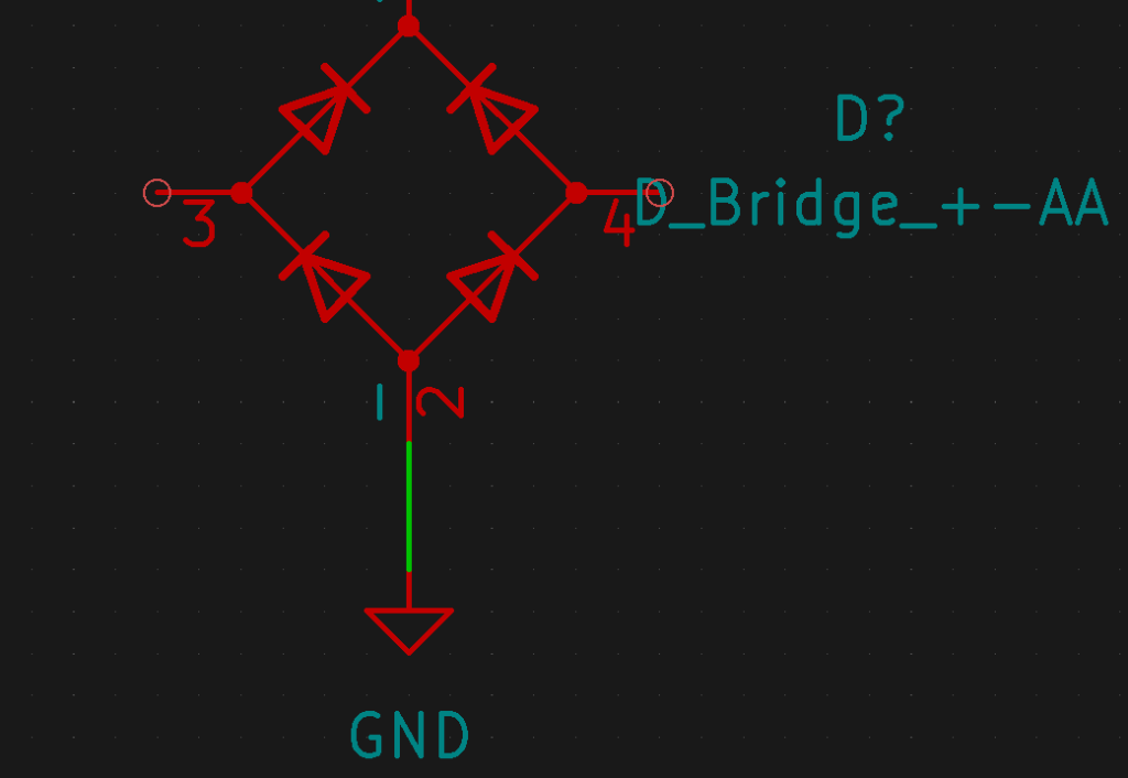 Naast ‘normale’ labels kent KiCad ook Power labels. Deze zijn kwa uiterlijk iets anders. De – poot van de gelijkrichter die komt aan de massa te hangen AKA GND. Druk op ‘P’ op je toetsenbord om een powerlabel toe te voegen en zoek op GND. Plaats de GND ergens onder de gelijkrichter en verbindt de onderste pin met de GND label.