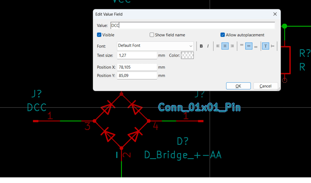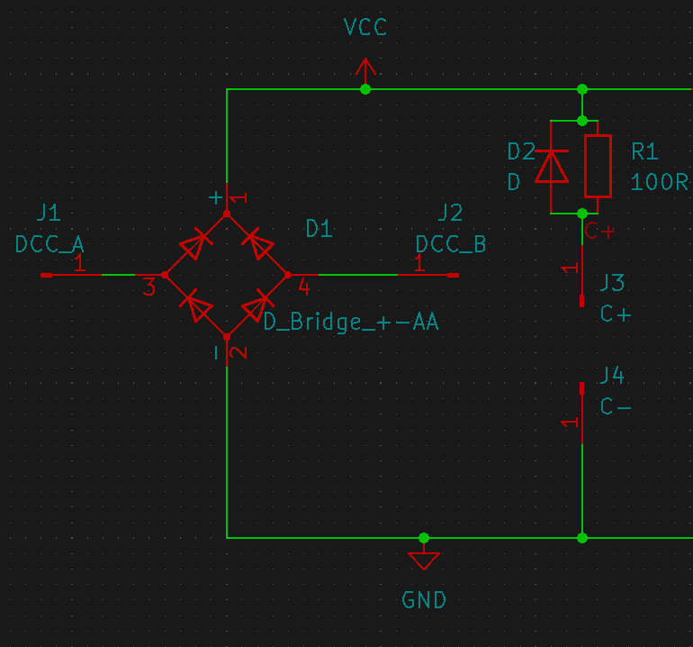 Plaats 2 van deze connectoren naast de gelijkrichter en verbindt ze met wires aan de AC pinnen van de gelijkrichter zoals op de afbeelding. Als de pinnen geplaatst zijn, kan je ze eventueel hernoemen naar iets anders zoals bijvoorbeeld ‘DCC.’ Dit heeft geen praktisch nut behalve dat de leesbaarheid van het schema beter wordt.