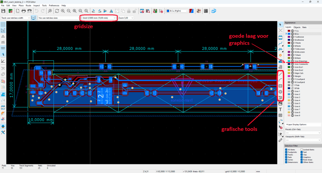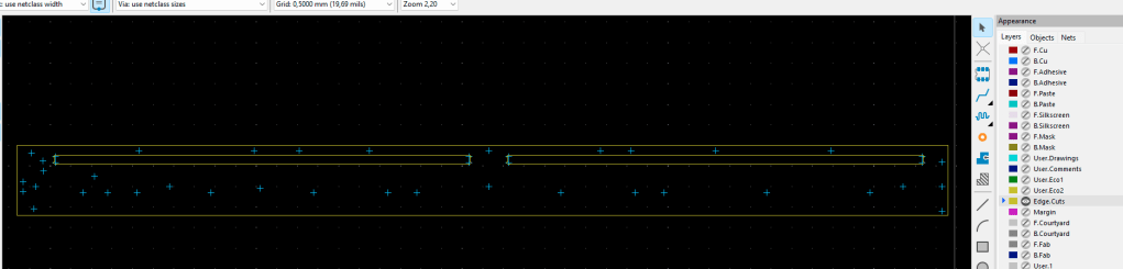 Tip: Je kan bij de oogje symbolen de verscheidene layers aan en uitzetten. In bovenstaande plaatje heb ik alles behalve de edge cuts layer uitgezet. Zo kan je soms beter zien wat je doet.