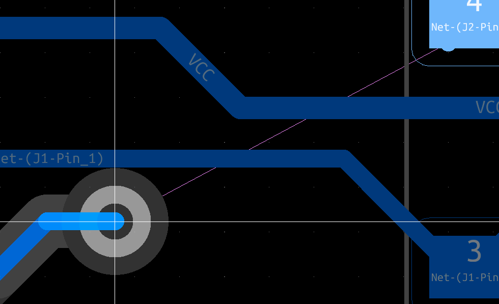 Soms moet je helaas kruisen. Probeer het te vermijden waar mogelijk, probeer dan om spoortje onder een footprint door te laten lopen. Wanneer je er echt niet omheen kan, dan moet je door middel van via’s naar de andere kant van de printplaat. Druk op de hotkey V om een via onder je muis te hangen, je kan hem plaatsen met je muis.