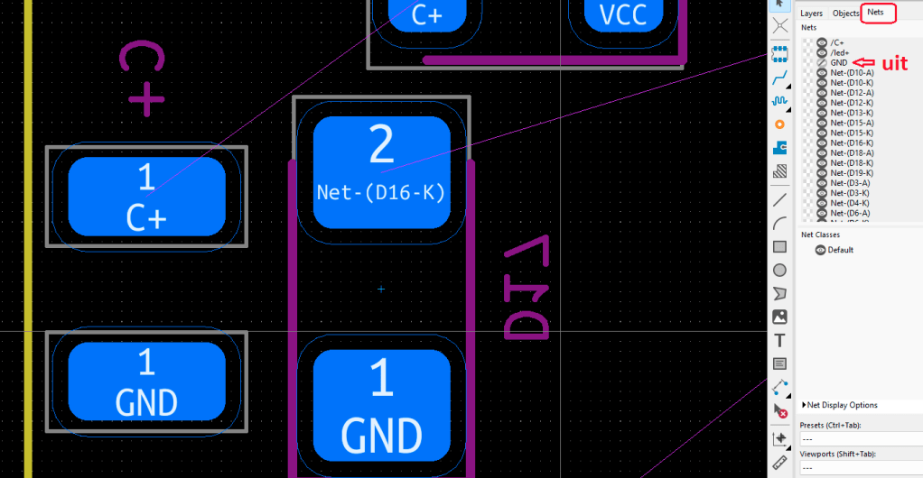 Je moet nu alle printsporen gaan trekken. Voordat we dat doen, wil ik je alleen vertellen om niet de GND pinnen te routen, daar hebben we andere plannen voor. Als je wilt (hoeft dus niet), kan je in de rechter kolom op ‘nets’ klikken, dan kan je airwires voor GND uitzetten.