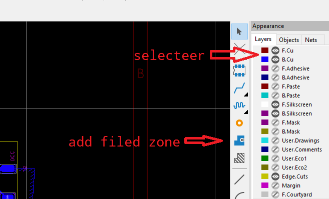 Als je nu op de ‘B’ toets drukt, dan wordt de zone gevuld met koper. Je kan de koper zone uit en aanzetten met deze knoppen links op het scherm. Je ziet nu ook dat de GND pinnen automatisch zijn verbonden met de ground zones.