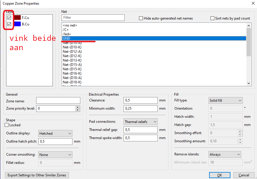 Voor SMD printen is het meestal handig om aan zowel de TOP als BOTTOM kant een ground layer te hebben. Vink beide boxen aan in de linker kant en selecteer onder NET de GND net. Gebruik de filter als je hem niet kan vinden. Klik OK als je klaar bent.