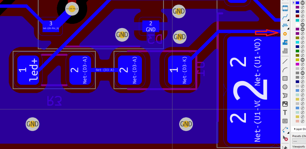 Je hebt nu 2 ground zones aan de boven- en onderkant van de print. Als je alleen maar SMD pads heb, zijn de zones niet verbonden met elkaar. En alle sporen lopen voorkomen dat sommige GND pads geen verbinding hebben. Je moet nu extra via’s handmatig poppen om de GND vlakken met elkaar te verbinden. Bij elke GND pad, daar moet je zelf een via neerzetten. Ook bij onderbrekingen en uitlopers daar mag je een via neerzetten. Klik op de via knop bij de pijl of druk de V toets in om via’s te plaatsen. Dan is het slechts een kwestie van klikken op je board.