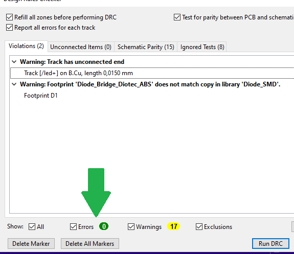 Als je geen Errors heb, kan je je board veilig laten produceren. De standaard instellingen in KiCad zijn toereikend voor JLCPCB