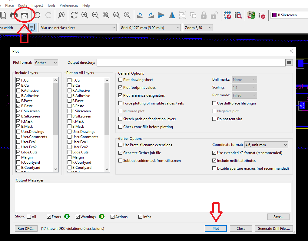 Gerber bestanden zijn bestanden die de printenboeren nodig hebben om je boards te kunnen fabriceren. In KiCad klik je op de ‘Plot’ knop. Er opent een nieuw venster. Klik op de Plot knop (onderste pijl) om de gerbers aan te maken.
