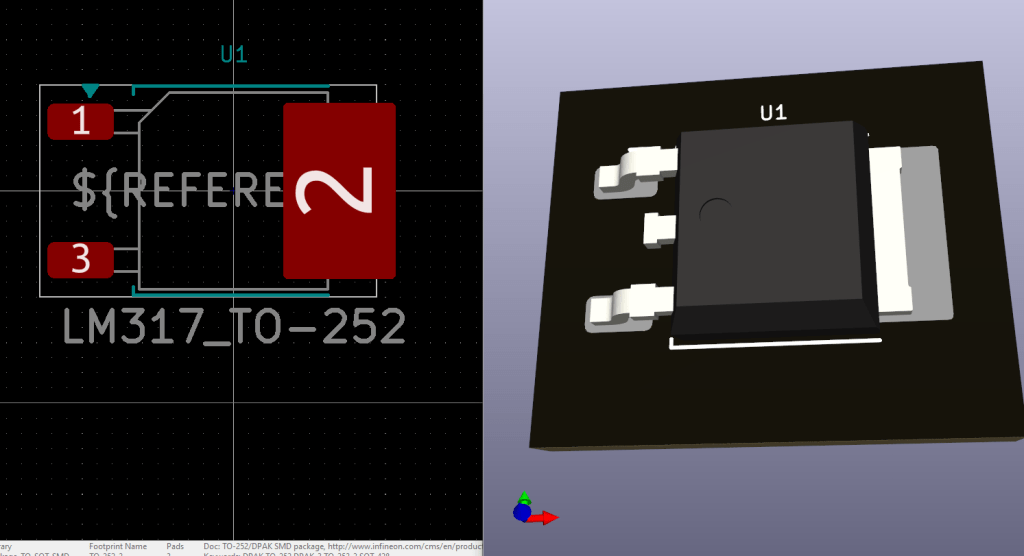 Het circuit van de stroombron bestaat uit een LM317 IC en een weerstand. Als je de LM317 gaat toevoegen, zal je veel varianten zien. Kies degene uit waar achter staat TO-252, dit is een SMD behuizing met een geschikte grootte. Voor de weerstand heb ik door trial en error achterhaald dat 470Ohm mij een mooie lichtsterkte oplevert. Je kan er ook voor kiezen om bijvoorbeeld een weerstand van 300Ohm te gebruiken te samen met een instelbare potmeter van 300Ohm zodat je zelf achteraf de helderheid kan instellen. De potmeter moet dan in serie komen te staan met de weerstand.