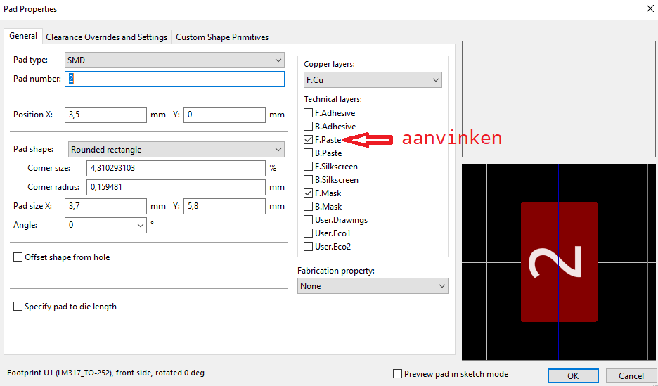 Tijdens het solderen, had ik een kleine, geen grote, moeite om het grote vlak van de TO252 (onze stroombron) te solderen. Dit kwam hoofdzakelijk doordat het component de gehele grote pad bedekte. Tevens kan deze grote pad problemen geven als je soldeerbout niet genoeg vermogen heeft. Daarom laat ik hier zien, hoe je de footprint kan aanpassen.
