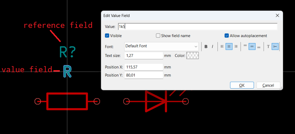 Elk component komt met een ‘reference field’ (R?) en een ‘value field’. Voor weerstanden is het gebruikelijk dat je de weerstandswaarde invult. Als je dubbel klikt op de R dan kan je een waarde toevoegen. Maar dit gaan we later doen omdat we nog niet weten wat deze waarde moet zijn. De R? daar hoef je je ook niet druk om te maken. In een schema krijgt elk component een prefix (R voor weerstand, D voor diode, U voor een IC etc) en een getal. Dit getal kan KiCad zelf voor ons invullen.