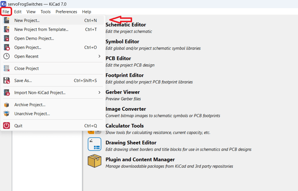 Als je KiCad opent, is het eerste wat je moet doen een nieuw project openen. Klik op File -> New Project en vind een goede locatie in de browser