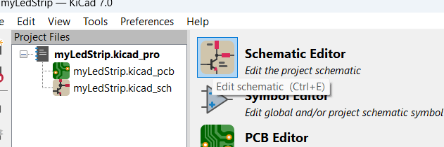 KiCad maakt voor je een schema en board bestand aan. We beginnen meestal in het schema dus klik op de ‘schematic editor’ om het schema te openen.