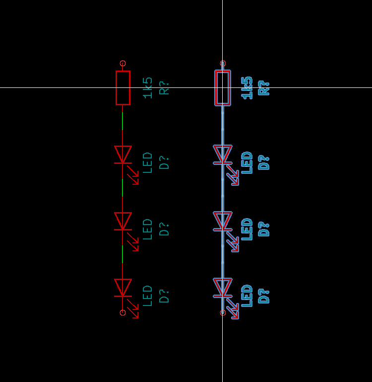 Als je de LED geplaatst heb zoals de weerstand, kan je hem selecteren met je muis en met Ctrl-C en Ctrl-V kan je hem kopiëren en plakken. Zet de weerstand en de drie leds achter elkaar waarbij de leds in dezelfde richting staan. De componenten kan je aan elkaar verbinden met een wire. Een wire kan je zetten door op een verbindingsbolletje (pin) van een component te klikken. De lijn volgt je muis, klik op een ander bolletje om een verbinding te leggen.