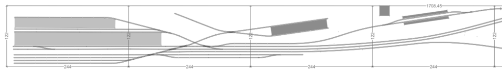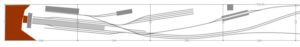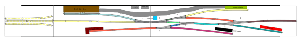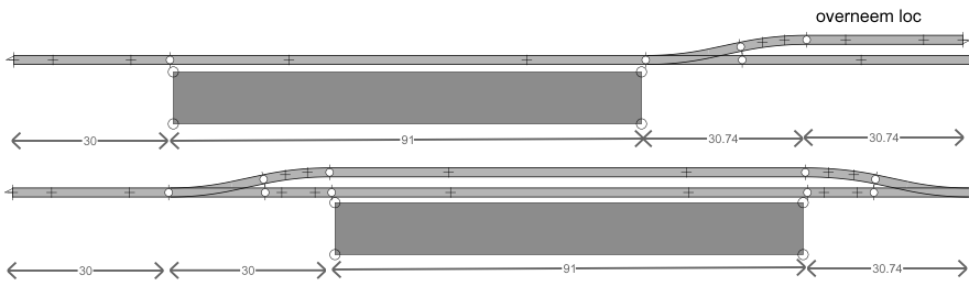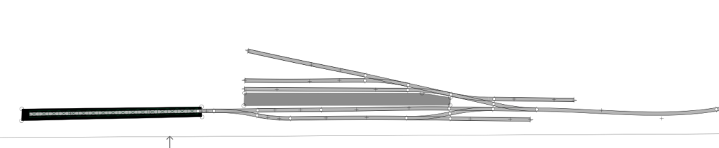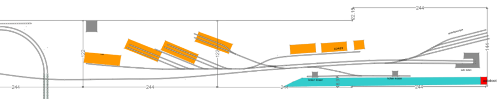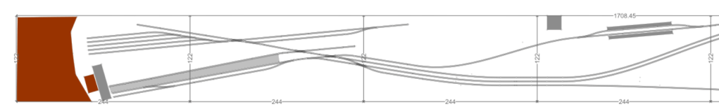 Je ziet dat het perron in het bovenste plan meer naar links licht met 30cm. Zou je de wissel naar de overneem loc nu ook 30cm naar rechts plaatsen, dan kan je perron ook 30cm langer zijn en dat levert een rijtuig lengte op.